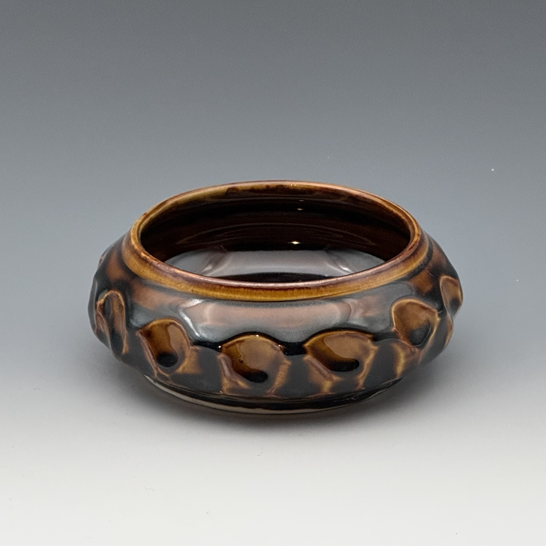 A hand-thrown bowl with hand-cut facets and a rich rootbeer glaze — a warm, deep amber-brown that pools in the cuts and catches the light differently at every angle. The facets are carved into the clay before firing, giving each face a slightly varied surface. 5 inches diameter, 2 inches tall. Cone 11, gas-fired. Handmade at Fireborn Studios, Pittsburgh.