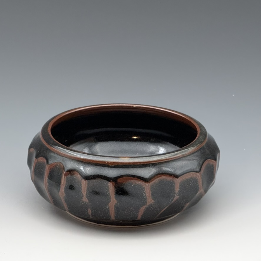 A hand-thrown bowl with hand-cut facets and a deep tenmoku glaze — a rich, dark glaze rooted in East Asian tradition, ranging from deep black to dark brown where the glaze thins over the ridges of the facets. The contrast between the dark glaze and the cut edges creates a striking visual texture. 5 inches diameter, 3 inches tall. Cone 11, gas-fired. Handmade at Fireborn Studios, Pittsburgh.